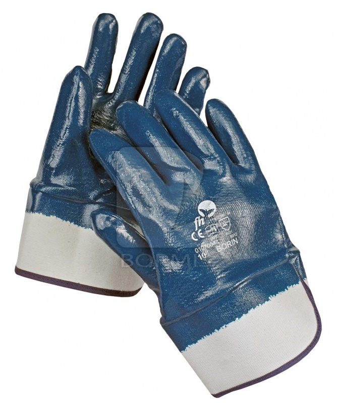 Rukavice šité z bavlneného úpletu, máčané, s hrubšou vrstvou nitrilu (protišmykové uchopenie) so širokou manžetou s možnosťou navliecť na odev.