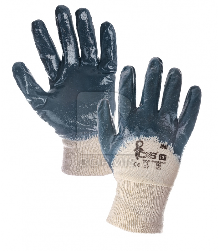 Rukavice polomáčané v modrom nitrile s úpletovou manžetou.