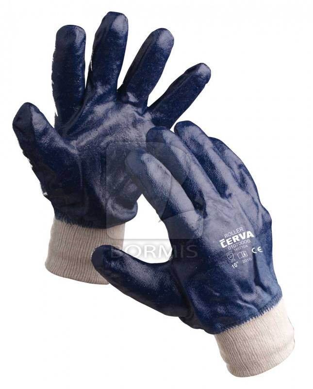 Modré rukavice šité z bavlneného úpletu, celomáčané v nitrile, s pružnou manžetou.