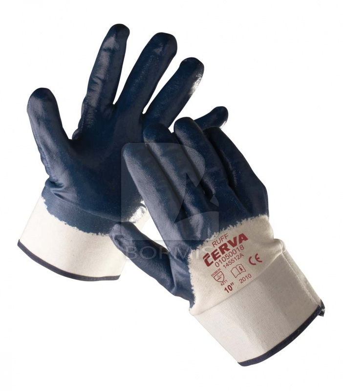 Modré rukavice šité z bavlneného úpletu, polomáčané v nitrile, s pevnou manžetou.