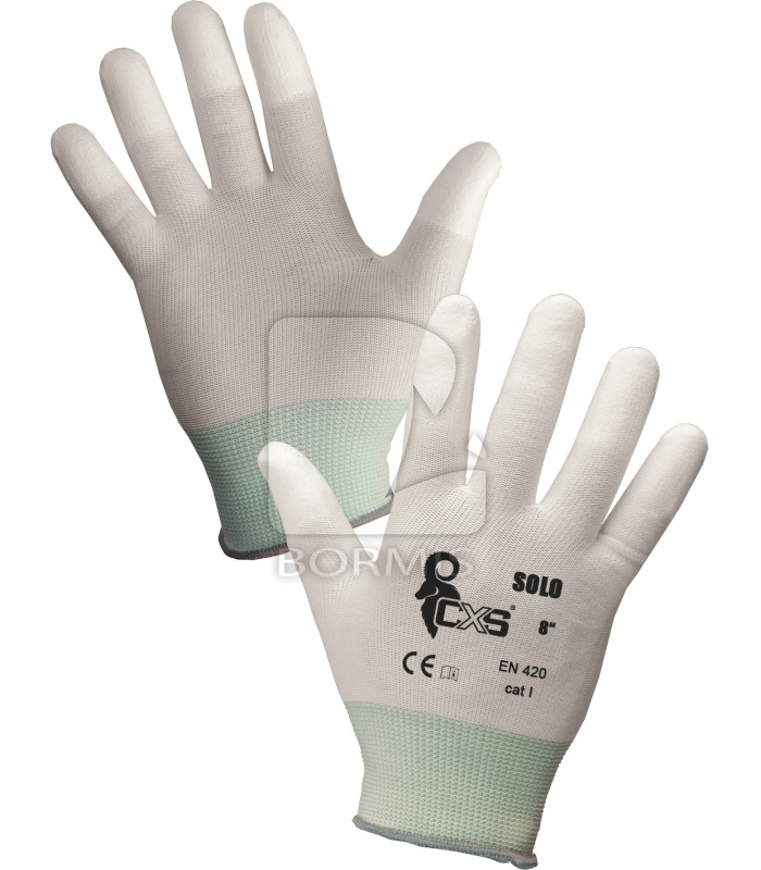 Rukavice s koncami prstov máčanými v polyuretáne. Pružná manžeta.