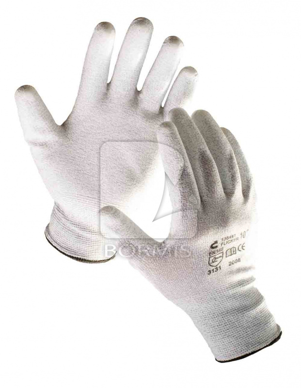 Pletené, bezšvové, antistatické, nylonové rukavice s integrovaným uhlíkovým vláknom, vrstvou polyuretánu v dlani a na prstoch a pružnou manžetou.