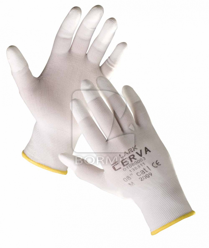 Pletené, bezšvové, nylonové, rukavice s tenkou vrstvou polyuretánu na špičkách prstov a pružnou manžetou.
