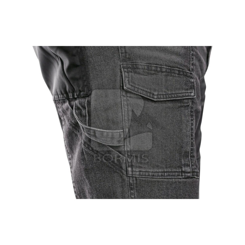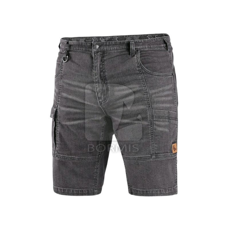 Pánske rifľové krátke nohavice. Pás s pútkami na opasok, dve zadné vrecká s materiálu CORDURA, bočné multifunkčné vrecká, plastové pútko.