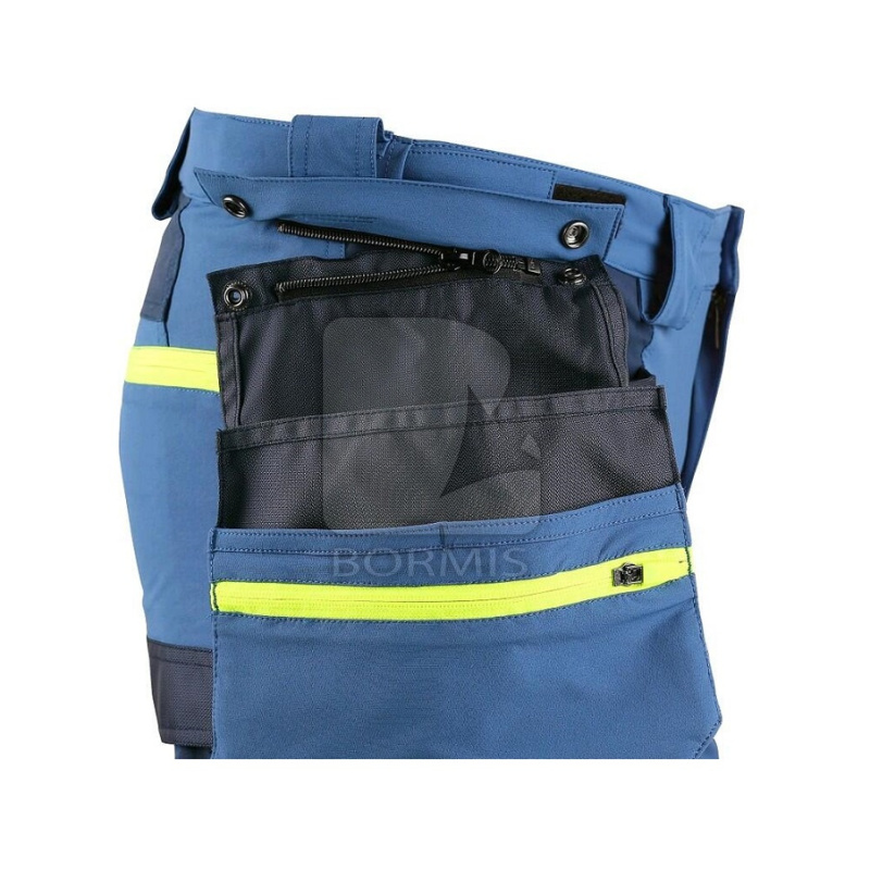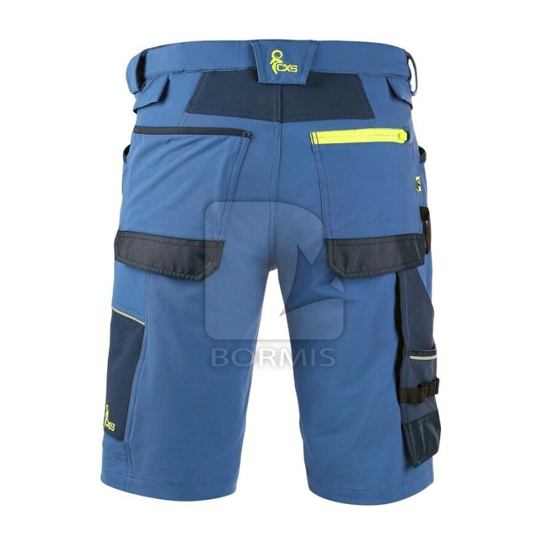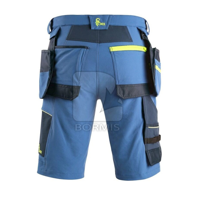Pánske pracovné krátke nohavice. 4-way stretch materiál umožňujúci ľahký a voľný pohyb. Vnútorná protišmyková páska v páse, doplnky s materiálu CORDURA, flexibilný pás s možnosťou upravenia veľkosti, pútka na opasok, 2 predné vrecká, 2 odnímateľné vrecká na náradie vystužené materiálom CORDURA, vrecko na zips na stehne s odnímateľným puzdrom na ID, multifunkčné bočné vrecko a 2 zadné vrecká vystužené materiálom CORDURA. Kontrastné doplnky, reflexné doplnky.