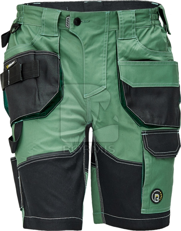 Pánske pracovné šortky, elastická inovatívna tkanina TRIFIBETEX - ergonomický strih, nízky elastický pás, trvanlivé trojité prešívanie nohavíc a rozkroku, priestranné multifunkčné predné vrecká s popruhom na náradie, 2 zadné vrecká s príklopkami s oxfordským vystužením, stehenné vrecko na telefón s príklopkou so suchým zipsom, vrecko na pravítko; vrecko na nôž, oko na kladivo, D-krúžok, popruh na nástroj v páse, pôvodné spracovanie zapínania rázporku, reflexný odtieň vo farebných častiach.
