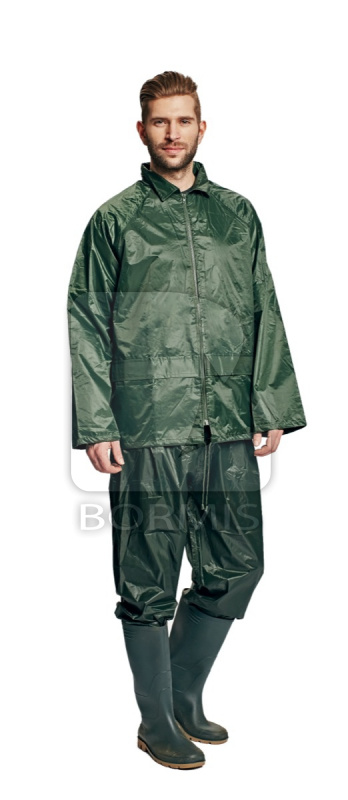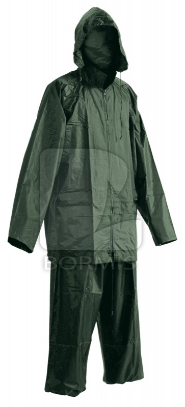 Vodeodolný dvojdielny ochranný oblek s kapucňou v praktickom balení. ¾ plášť , nohavice na gumu. Dve predné vrecká kryté légami chrániacimi voči prieniku vody. Spodnú časť rukávov možno regulovať. Ventilácia na chrbte a v podpazuší. Transportný obal.