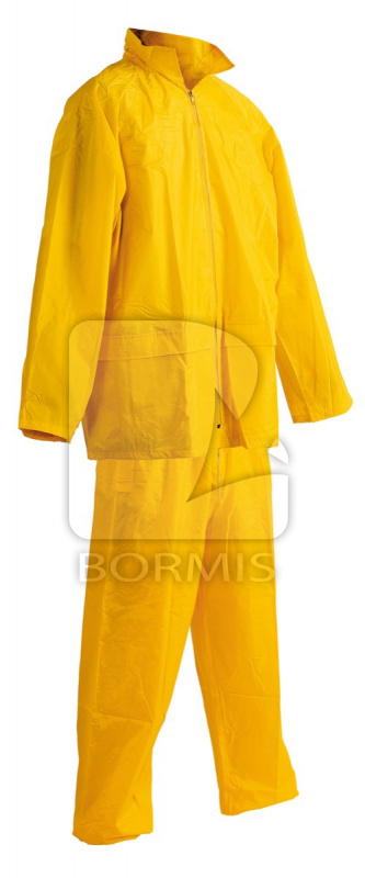 Vodeodolný dvojdielny ochranný oblek s kapucňou v praktickom balení. ¾ plášť , nohavice na gumu. Dve predné vrecká kryté légami chrániacimi voči prieniku vody. Spodnú časť rukávov možno regulovať. Ventilácia na chrbte a v podpazuší. Transportný obal.