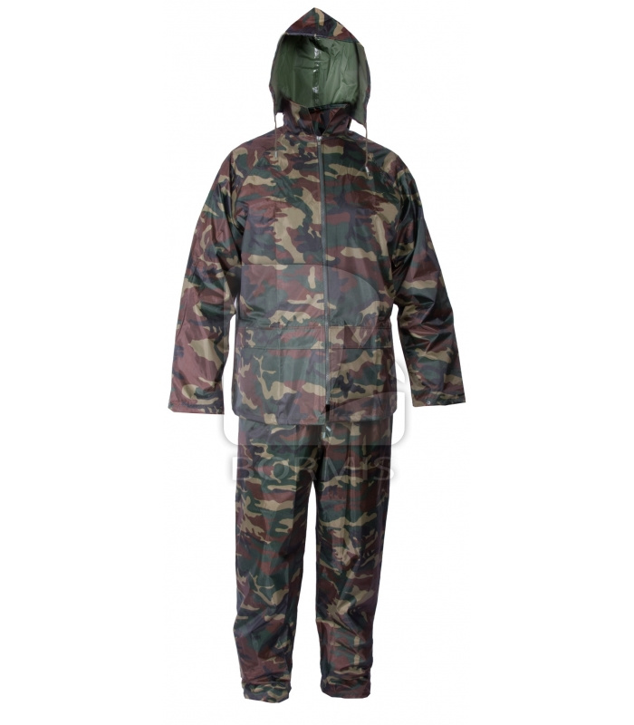 Vodeodolný odev, nohavice v páse do gumy, bunda s kapucňou v golieri, zapínanie na zips, nízka hmotnosť, v praktickom balení.