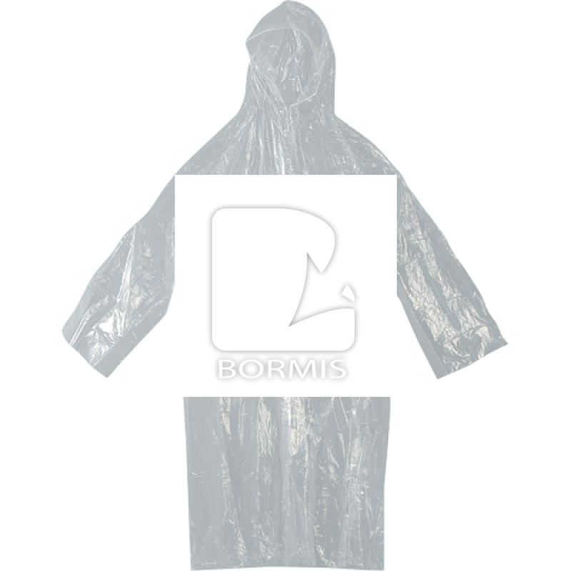 Ľahká PE pláštenka na ochranu pred dažďom, univerzálna veľkosť, farba priehľadná. Predné zapínanie na plastové cvoky, všetky spojovacie švy sú zatavené, transportný obal.