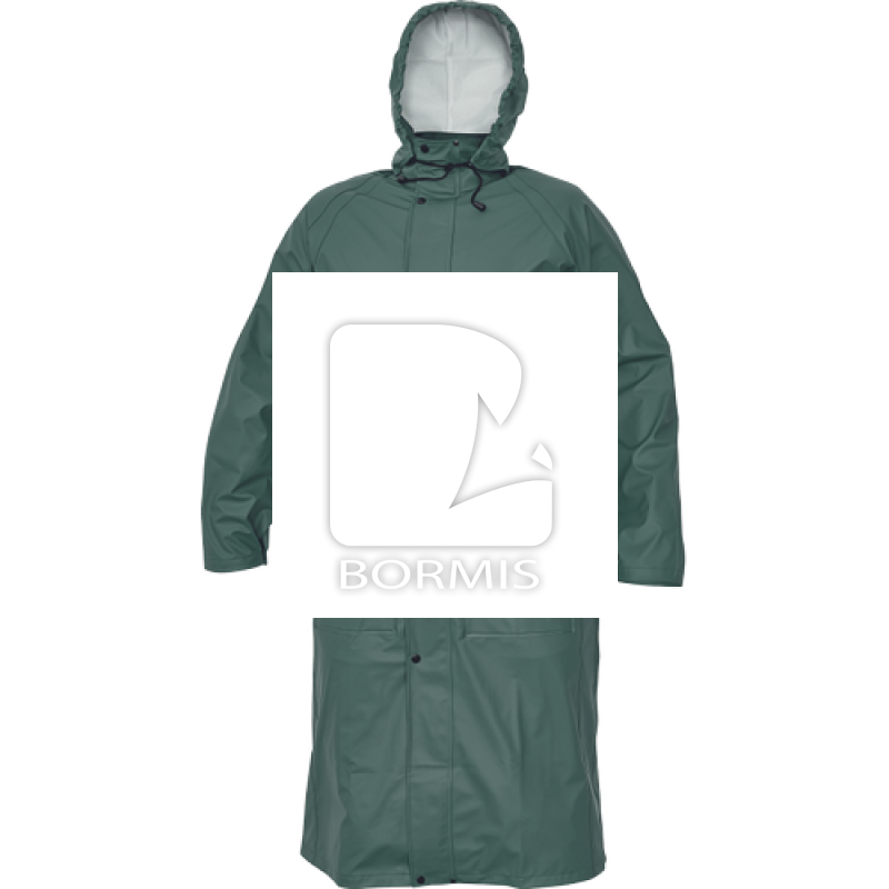 Nepremokavý 3 plášť s kapucňou v golieri, dĺžka 120 cm, vodný stĺpec 2000 mm. Kryté zapínanie na zips a prekryté vrecká. Ľahký, flexibilný, nešušťavý, na dotyk príjemný materiál.