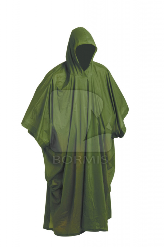 Veľké PVC pončo, pevná kapucňa so sťahovaním, po bokoch zapínanie na patentky, univerzálna veľkosť, rozmery 240 x 125 cm, ideálne pre cykloturistiku, farba zelená.