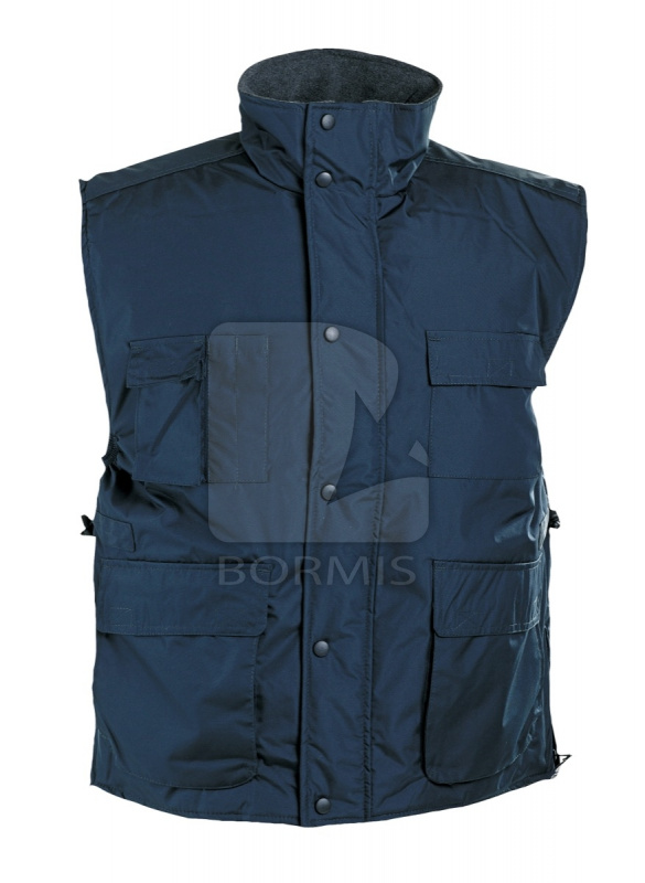 Zateplená nepremokavá vesta, odolná vetru (prispôsobená strojovému vyšívaniu) s podšívkou a so zipsom, sťahovacia šnúrka v páse.