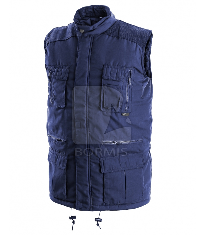 Zateplená vesta, ramená a golier pošitý menčestrom, pružné stiahnutie prieramku, možnosť stiahnutia vesty v páse, 14 vreciek - z toho 3 vreckávo vnútri vesty.
