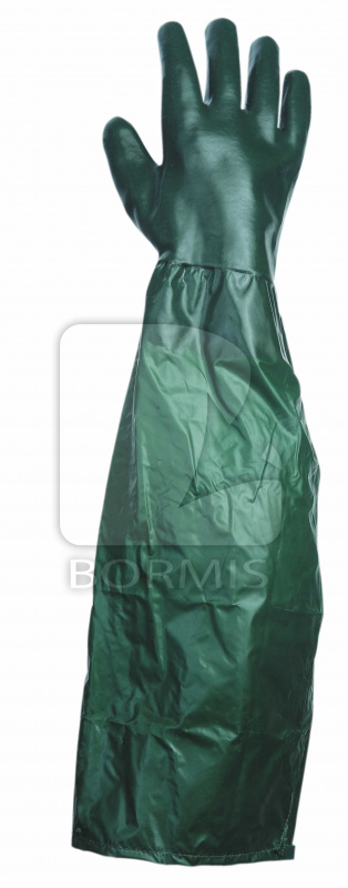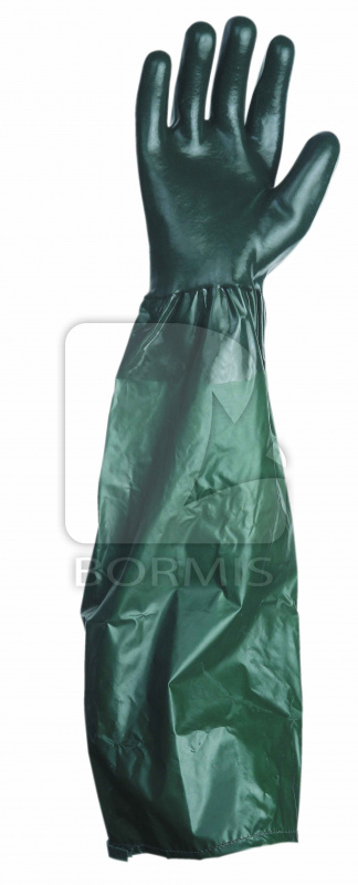 Rukavice šité z bavlneného úpletu, máčané v PVC s obsahom nitrilu, odolné mechanickým a chemickým rizikám, v celkovej dĺžke 65 cm.