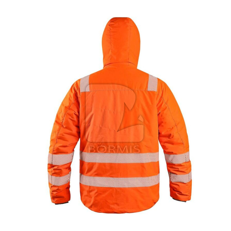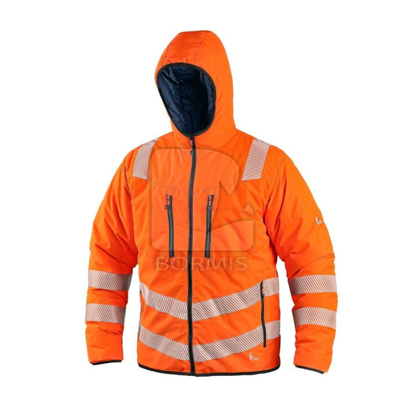 Pánska výstražná obojstranná bunda, zateplená. Kapucňa napevno, rukávy a spodný lem do gumičky. Vrchná časť má náprsné vrecká na zips, bočné vrecká na zips a segmentované reflexné pásky. Vnútorná strana bundy má náprsné vrecko na zips, bočné vrecká na zips, kontrastné žlté a reflexní doplnky. Doporučené použitie: stavebníctvo, cestári, vodiči, letecká a lodná doprava, logistika, vodiči kamiónov, polícia. Norma: EN ISO 20471, EN 14058