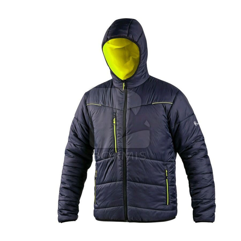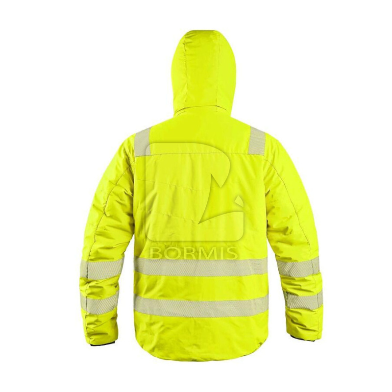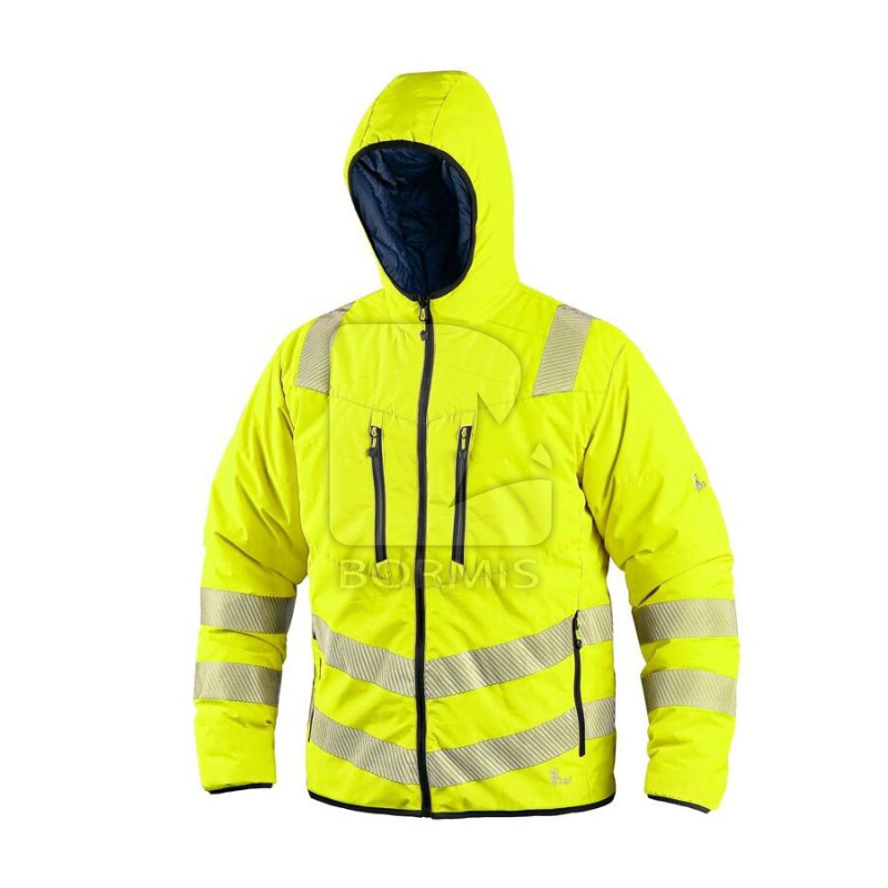 Pánska výstražná obojstranná bunda, zateplená. Kapucňa napevno, rukávy a spodný lem do gumičky. Vrchná časť má náprsné vrecká na zips, bočné vrecká na zips a segmentované reflexné pásky. Vnútorná strana bundy má náprsné vrecko na zips, bočné vrecká na zips, kontrastné žlté a reflexní doplnky. Doporučené použitie: stavebníctvo, cestári, vodiči, letecká a lodná doprava, logistika, vodiči kamiónov, polícia.