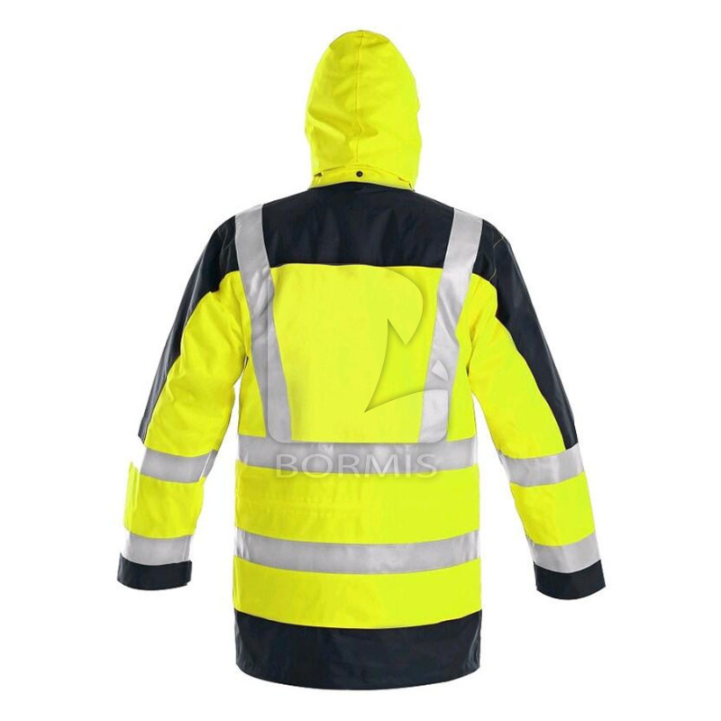 Pánska výstražná zimná bunda 5 v 1 s odnímateľnou vnútornou bundou, odolná proti vode a vetru, 3M reflexné pruhy, lepené švy. Vonkajšia bunda: 2 spodné vrecká s pätkou, 2 náprsné vrecká, zips krytý légou zapínanou na cvoky, kapucňa v golieri, regulovateľné manžety na suchý zips. Možnosť regulácie veľkosti v páse i v dolnej časti bundy. Vnútorné vrecká: na pravej strane vrecko na mobil, na levej strane väčšie vrecko na peňaženku. Vnútorná bunda s odopínacimi fleecovými rukávmi, 2 bočné vrecká kryté pätkou na suchý zips, vnútorné vrecko na ľavej strane. Doporučené použitie: stavebníctvo, cestári, vodiči, logistika, údržba, polícia, záchranári.