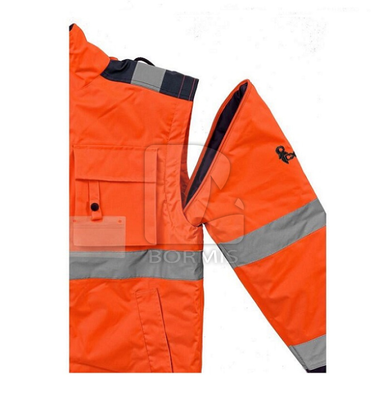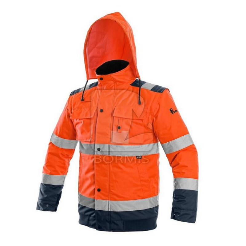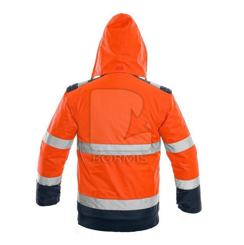 Pánska výstražná zateplená bunda do pása, 2 v 1, odolná proti vode a vetru, reflexné pruhy, lepené švy, zapínanie na zips krytý légou, odopínacie rukávy s regulovateľnými a vnútornými manžetami, kapucňa v golieri, fleecový vnútorný golier, 2 spodné vrecká, 2 náprsné vrecká kryté pätkou na suché zipsy, na ľavej strane pútko na prichytenie ID karty, na pravej strane slučka na rádiostanicu, 1 vnútorné vrecko. Vnútri je zips pre ľahkú aplikáciu výšivky na vonkajšej strane bundy. Doporučené použitie: stavebníctvo, cestári, vodiči, logistika, údržba, smetiari, záchranári, v zime a v mokrom prostredí, robotníci.