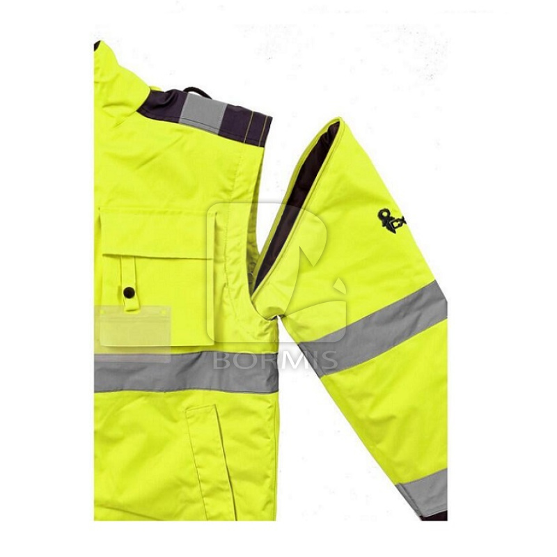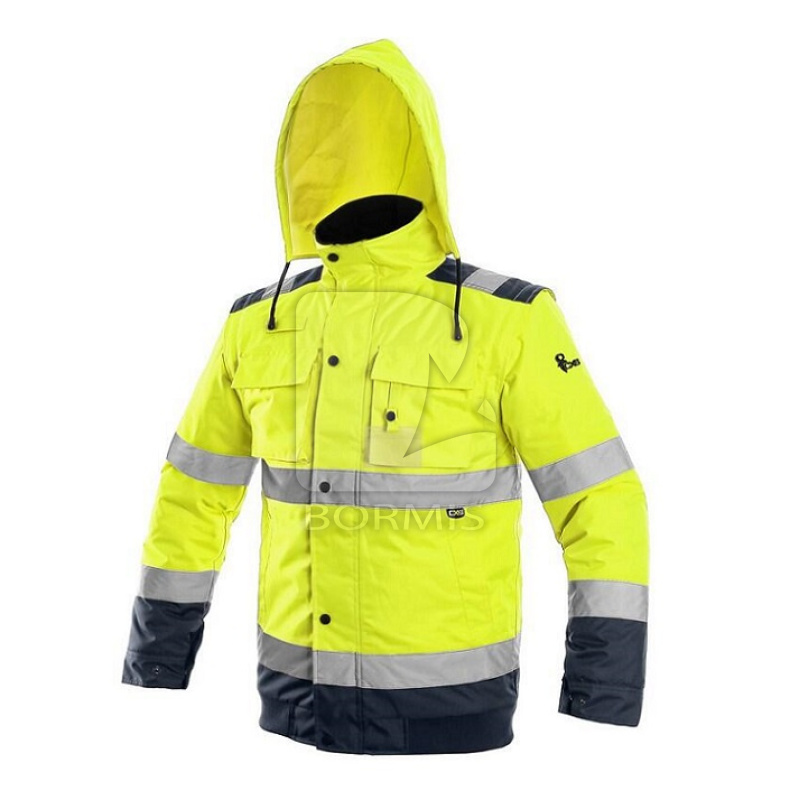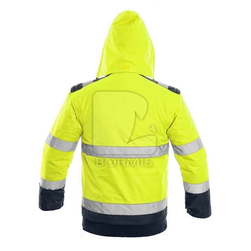 Pánska výstražná zateplená bunda do pása, 2 v 1, odolná proti vode a vetru, reflexné pruhy, lepené švy, zapínanie na zips krytý légou, odopínacie rukávy s regulovateľnými a vnútornými manžetami, kapucňa v golieri, fleecový vnútorný golier, 2 spodné vrecká, 2 náprsné vrecká kryté pätkou na suché zipsy, na ľavej strane pútko na prichytenie ID karty, na pravej strane slučka na rádiostanicu, 1 vnútorné vrecko. Vnútri je zips pre ľahkú aplikáciu výšivky na vonkajšej strane bundy. Doporučené použitie: stavebníctvo, cestári, vodiči, logistika, údržba, smetiari, záchranári, v zime a v mokrom prostredí, robotníci.