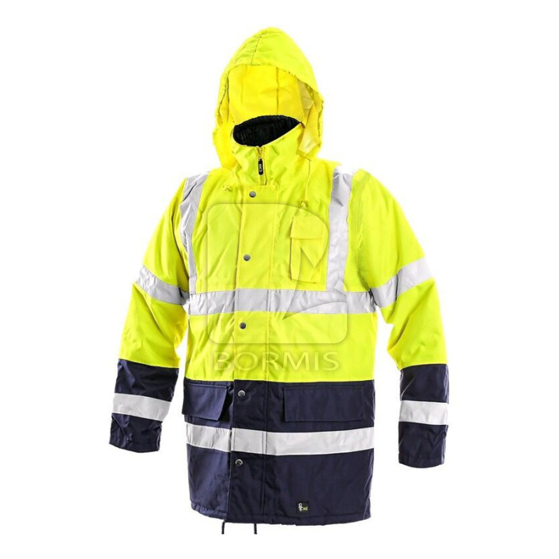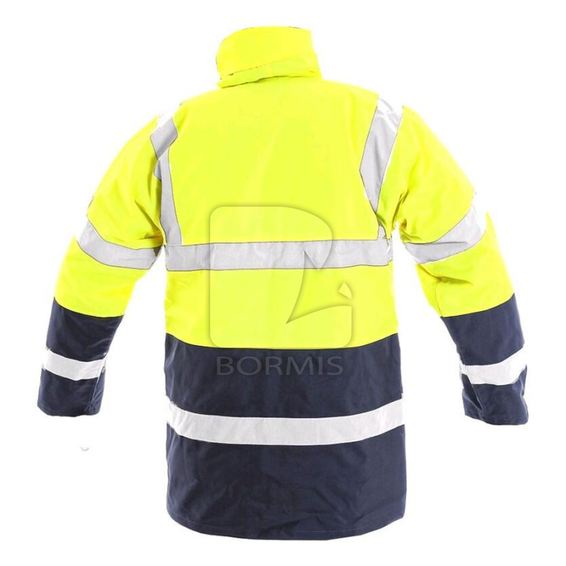 Pánska výstražná zimná bunda s reflexnými pruhmi a kapucňou v golieri, zateplená, odolná proti vode a vetru, kryté zapínanie na zips a cvoky, 3 vonkajšie vrecká + skryté vrecko pri hlavnom zipse, vnútorné náprsné vrecko, vnútorné manžety v rukávoch, sťahovanie v dolnom okraji, lepené švy. Doporučené použitie: stavebníctvo, cestári, vodiči, logistika, údržba, smetiari, záchranári, polícia, letecká a lodná doprava. Norma: EN 20471, EN 343+A1 Materiál: 100% polyester Oxford, podšívka 100% polyester, výplň 100% polyester