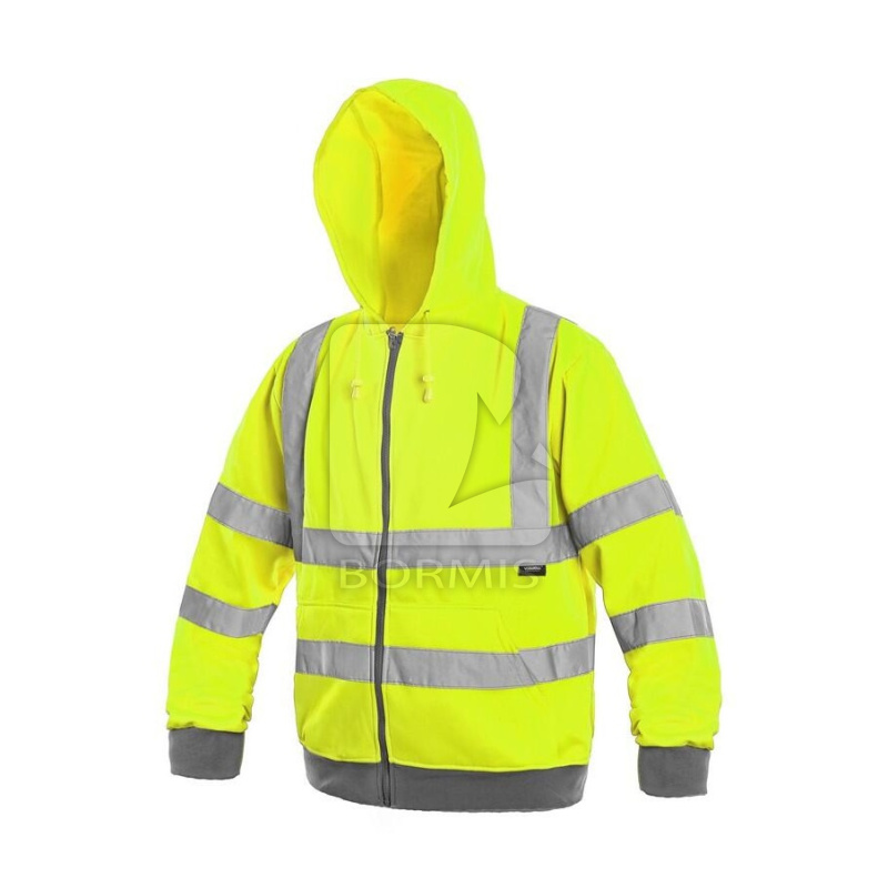 Výstražná mikina s reflexnými pruhmi a kapucňou, zapínanie na zips, hlavicové rukávy, pas a rukávy ukončené pružnou manžetou, dve spodné vrecká.