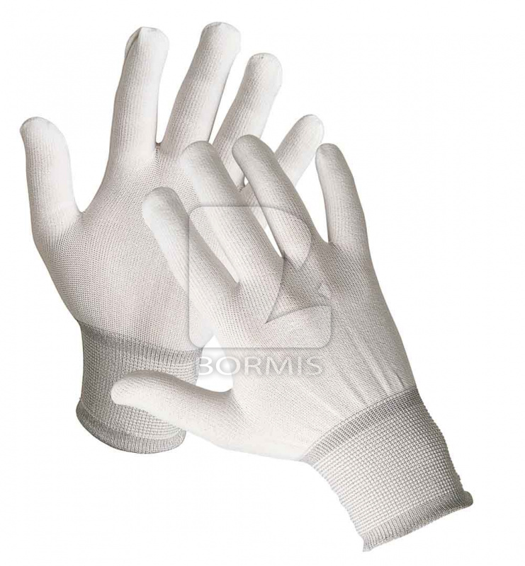 Biele bezšvové pletené rukavice z kučeraveného nylonu, s pružnou manžetou.