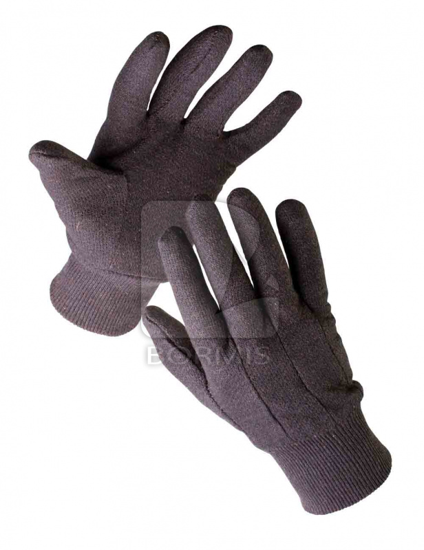 Rukavice šité z hnedej bavlnenej teplákoviny, s pružným nápletom.