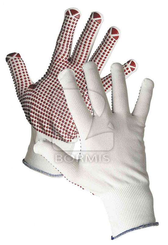 Pletené bezšvové nylonové rukavice s PVC terčíkmi v dlani a na prstoch a pružným úpletom na zápästí.