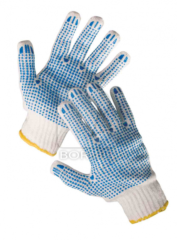 Pletené bezšvové obojstranné rukavice zo zmesi polyester/bavlna s PVC terčíkmi a pružným nápletom na zápästí.
