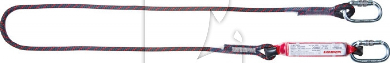 Tlmič pádu s PA spletaným 1,8 m dlhým lanom (O 10,5 mm), oválnou karabínou na tlmiči a lane, spĺňa normu EN 355 (CE 0082).