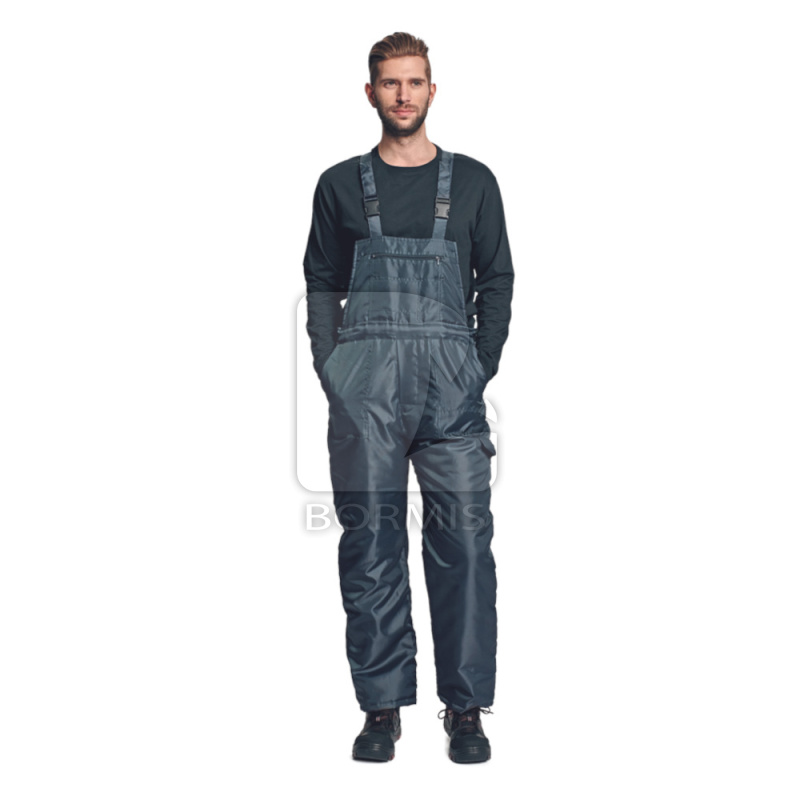 Zateplené nohavice s náprsenkou. Vetru a vodeodolné. Bočné zapínanie na gombíky. Vrecko na meter a pútko na kladivo. Nastaviteľné traky.