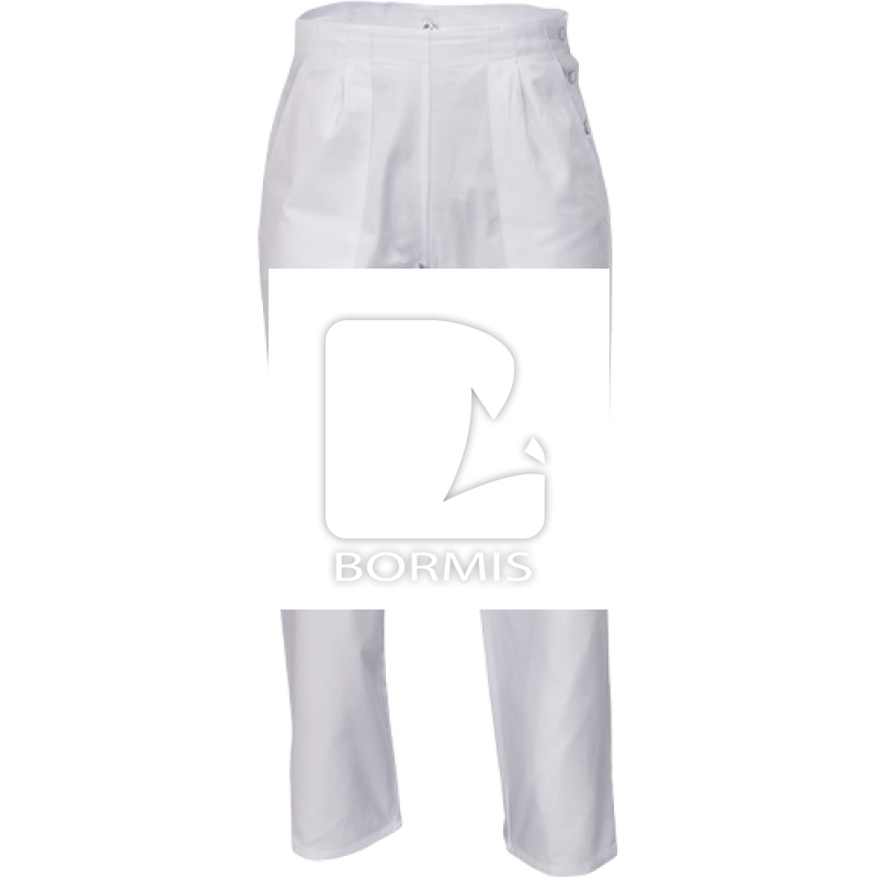 Dámske biele, pracovné nohavice. Zapínanie na boku na gombíky, 2 predné vrecká.