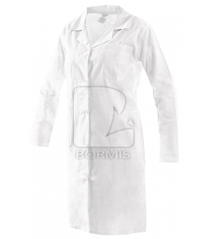 Dámsky plášť s dlhým rukávom, 3 predné vrecká, vzadu pásik s gombíkom na stiahnutie.