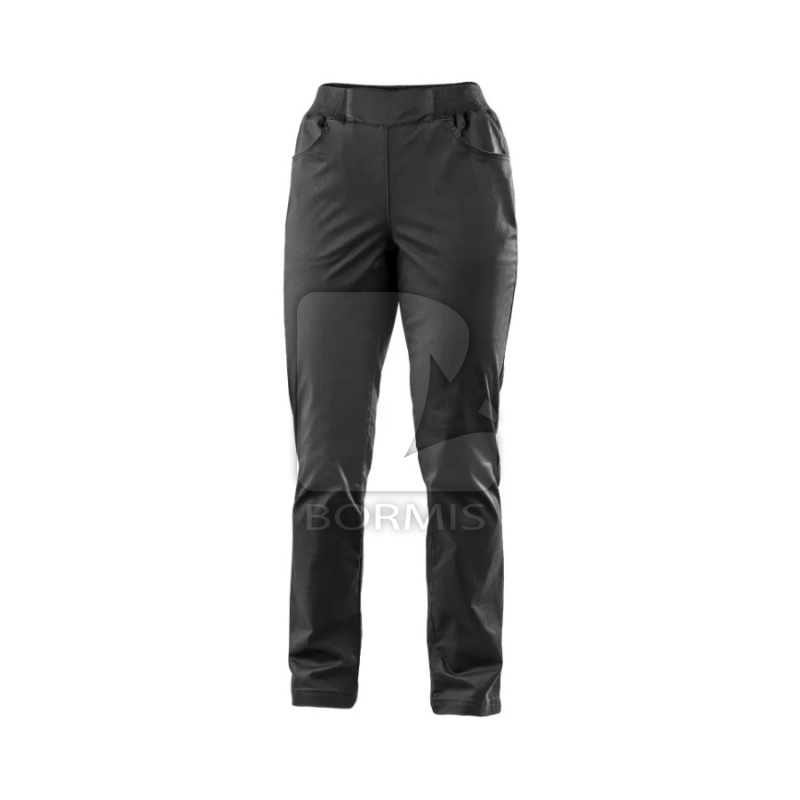 Dámske nohavice zo strečovej tkaniny sú navrhnuté na pohodlné nosenie počas celého pracovného dňa. Pružný materiál sa prispôsobuje pohybu a zabezpečuje vysoký komfort aj pri aktívnej práci. V páse sú nohavice doplnené čiastočne pružným rebrovým materiálom, ktorý sa dobre prispôsobí postave a zvyšuje pohodlie pri nosení. Praktické predné klinové vrecká umožňujú rýchly prístup k drobnostiam, zatiaľ čo dve našité zadné vrecká poskytujú ďalší priestor na uloženie osobných vecí. Nohavice sú vybavené systémom EASY-PROLONG, ktorý umožňuje jednoduché predĺženie strihu na vyššiu postavu uvoľnením kontrastného švu na nohaviciach. Model je dostupný v klasickej bielej a čiernej farbe, vďaka čomu sa ľahko kombinujú s pracovným aj voľnočasovým oblečením. Odporúčané použitie: gastronómia, zdravotníctvo, opatrovateľské zariadenia, lekárne, školy so zdravotníckym alebo gastronomickým zameraním, wellness prevádzky, kadernícke a kozmetické salóny, logistika, hobby.