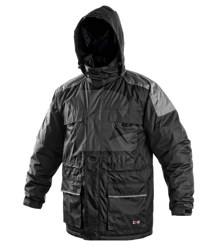 Zateplená bunda, odolná proti vode a vetru, kapucňa v golieri, rukávy zakončené regulovateľnou manžetou, sťahovanie v páse, lepené švy, 4 vonkajšie vrecká na zips kryté légou.