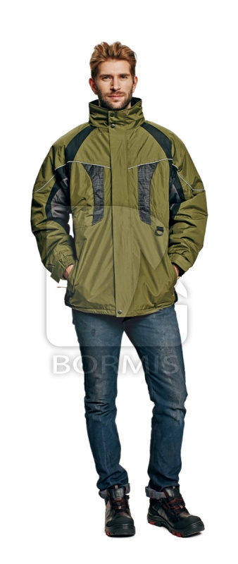 Nepremokavá zateplená bunda s kapucňou v golieri. Spodný lem so sťahovaním na šnúrku, vrchný materiál s mechanicky odolnou úpravou, reflexné doplnky.