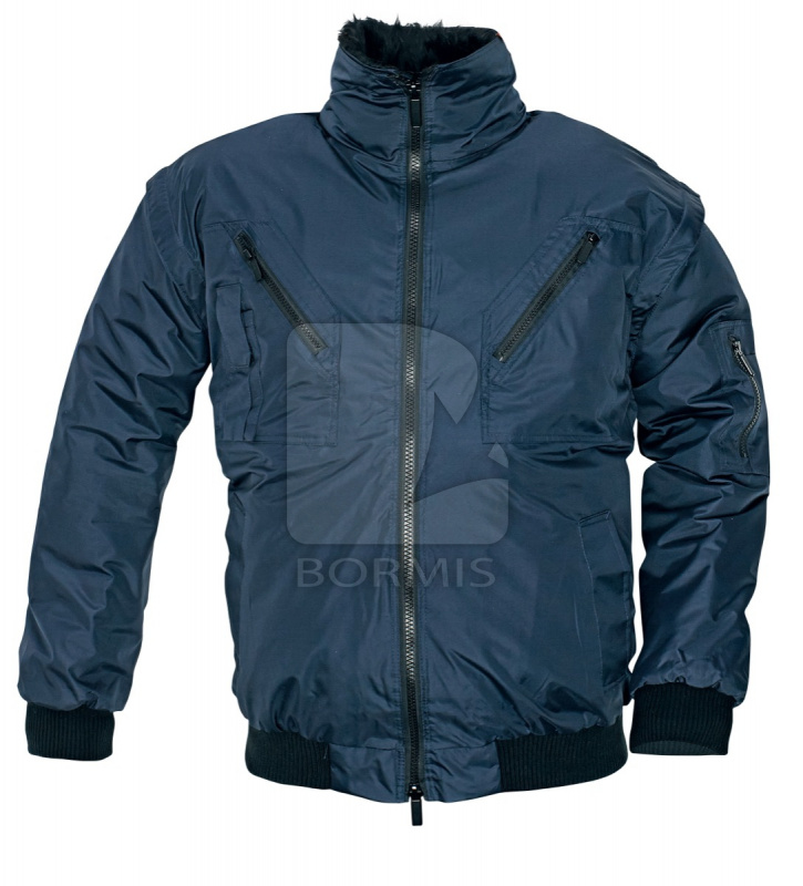 Zateplená nepremokavá bunda vzor „pilot“ s kapucňou v golieri a s odopínateľnou podšívkou a rukávmi. Odopínateľný golier z umelej kožušiny na suchý zips. Spodný lem a manžety rukávov z úpletu.