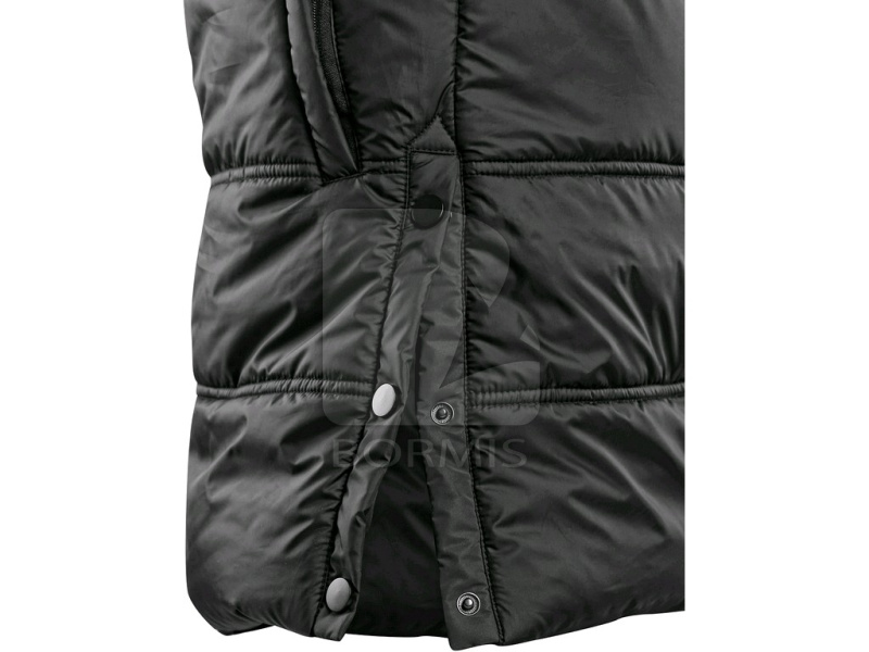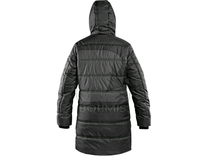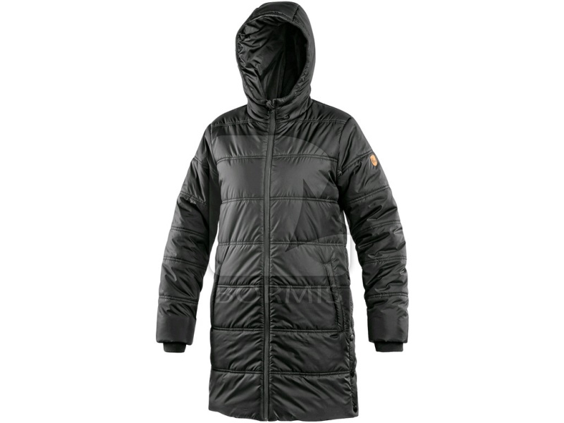 Dámsky zateplený kabát s kapucňou a bočným rozparkom na cvoky. Bočné vrecká na zips, rukávy ukončené pružnou manžetou, čierne reflexné doplnky na kapucni, rozparku a pozdĺž hlavného zipsu, vnútorné vrecko na zips.