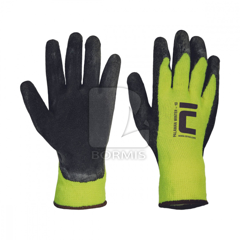 Zateplené bezšvové pletené rukavice zo syntetickej priadze s vrstvou mikroporézneho paropriepustného penového latexu v dlani a na prstoch a pružným nápletom na zápästí. Materiál: polyamid, latex