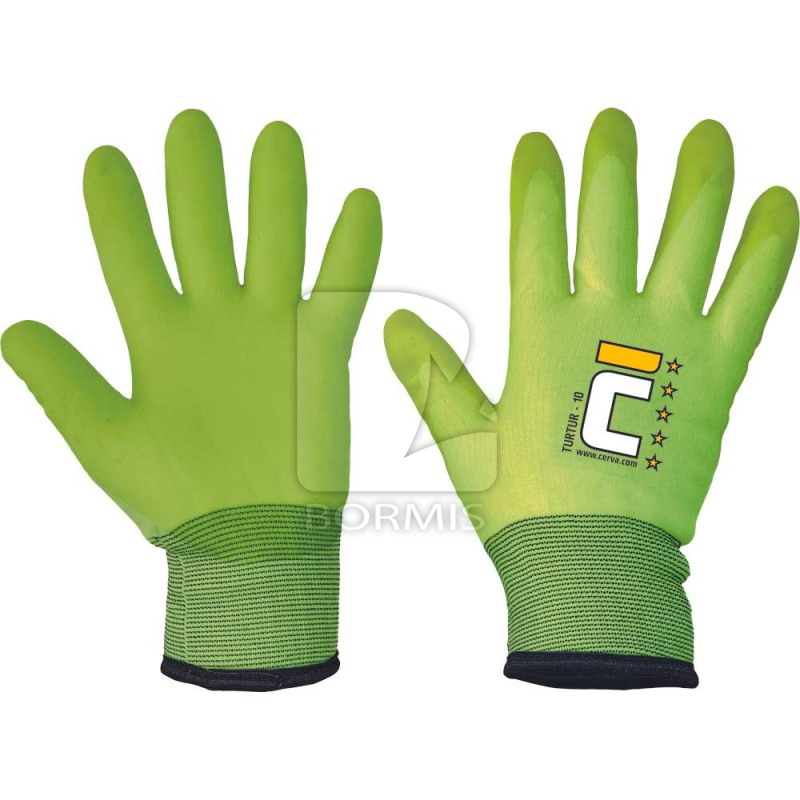 Zateplené, vodu odpudzujúce pletené signálne nylonové rukavice s vrstvou PVC v dlani a na prstoch, s komfortným froté zateplením a pružnou manžetou. Norma: EN ISO 21420, EN 388 (3231X), EN 511 (X2X)