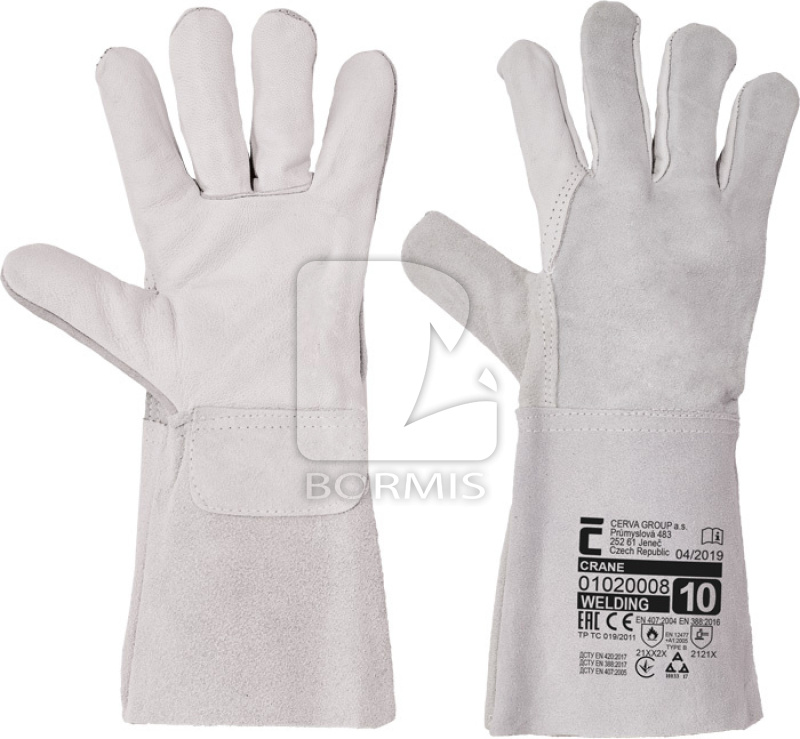 Celokožené rukavice z lícovej hovädziny v dlani, hovädzej štiepenky na chrbte, s pevnou 15 cm širokou manžetou, bez podšívky. Norma: EN 388:2016 (2121X), EN 420:2003+A1:2009, EN 12477:2001+А1:2005 (21XX2XType_B)