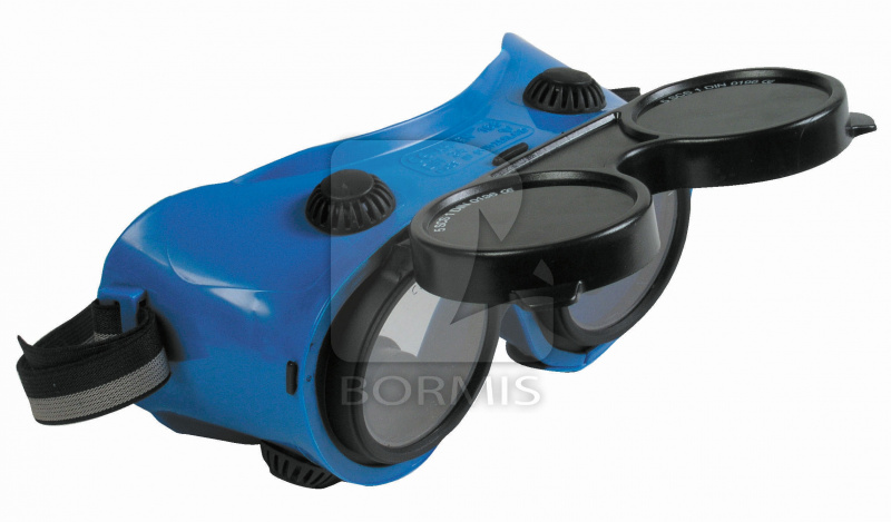 Modré ochranné nepriamo vetrané okuliare s odklápacími kruhovými zorníkmi triedy F, možnosťou nasadenia na dioptrické okuliare a ochranou proti žiareniu vznikajúcom pri zváraní, vhodné pri zváraní. Norma: EN 166.