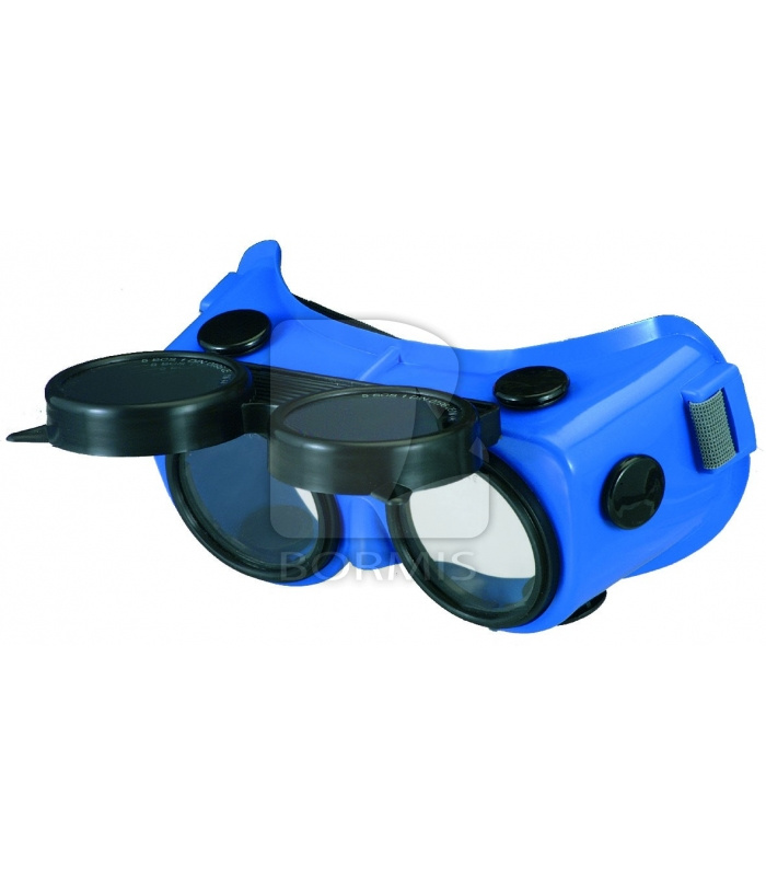 Uzavreté ochranné okuliare, s nepriamou ventiláciou a so sklopným rámom, očnice s čírymi zorníkmi, sklopný rám so zváračskými filtrami, ktoré slúžia k ochrane očí pred žiarením vznikajúcim pri spájkovaní, zváraní a rezaní kovu plameňom.