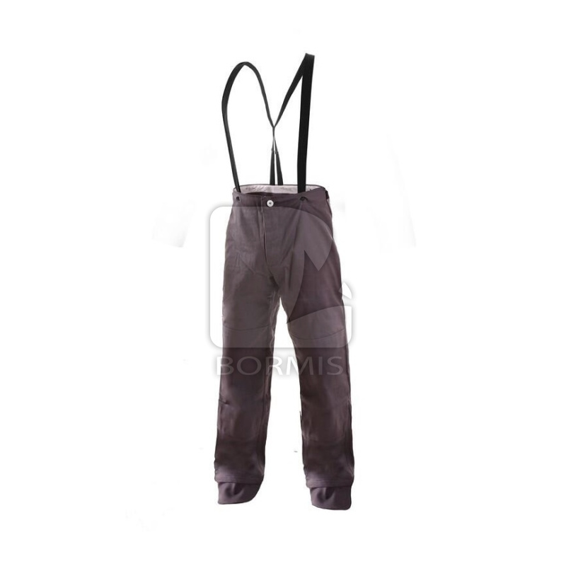 Pánske zváračské nohavice, zdvojené kolená našité zvnútra, pevný pás so zapínaním na gombíky, pravé zadné vrecko, traky s gumou vzadu, kryty cez obuv.